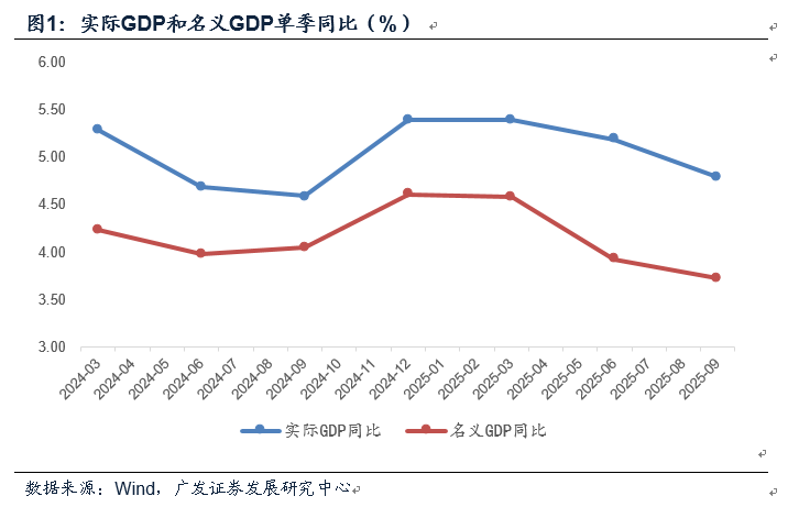 2025年三季度实际GDP同比增长4.8%,和我们前期报告推算的4.79%吻合。名义GDP同比增长3.73%,略高于我们预期的3.60%。三季度经济增速较上半年有所放缓,但整体在预期之内。国内前三季度实际GDP同比5.2%,在全球经济中仍属较高增速,展现出中国经济强大的韧性。[1]IMF对2025年全球经济增速的最新预测是3.2%,其中发达经济体和新兴市场分别为1.6%、4.2%。不过国内前三季度名义GDP同比的4.1%依然偏低,是约束微观体感的因素之一。