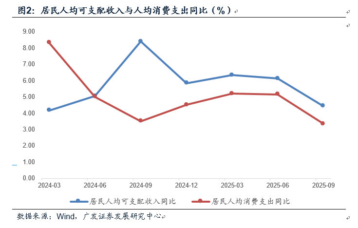 前三季度居民人均可支配收入、人均消费支出累计同比分别为5.1%、4.6%,隐含的单季同比分别为4.5%(前值5.1%)、3.4%(前值5.2%)。