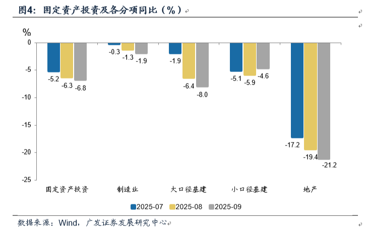 9月固定资产投资累计同比-0.5%,低于前值的0.5%。隐含9月当月同比-6.8%,前值-6.3%。
