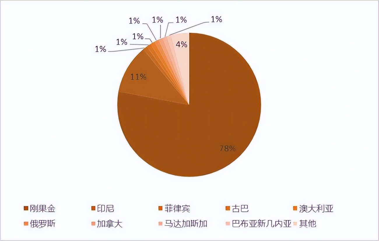 从有效供给产量来看,刚果(金)占全球近八成,印尼为11%,其余菲律宾、古巴、澳大利亚、俄罗斯等国占比均很小。