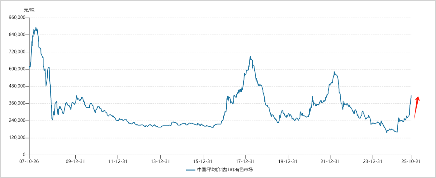 一系列调控动作之下,钴价一飞冲天,开启新一轮大周期。截至10月21日,国内钴价已飙至41.7万元,较本轮低点累涨160%以上。