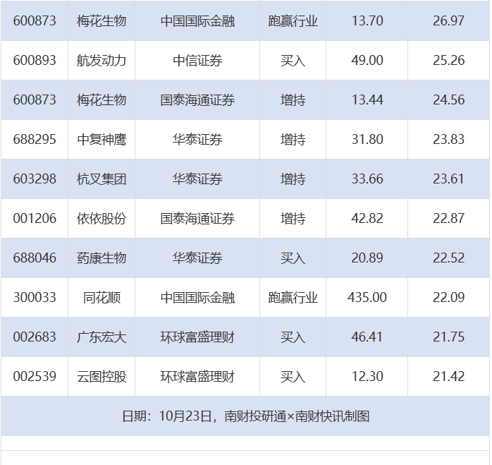 从券商推荐家数来看,10月23日有59家上市公司得到券商推荐,其中同花顺获得5家推荐,乖宝宠物获得4家推荐,梅花生物获得3家推荐。