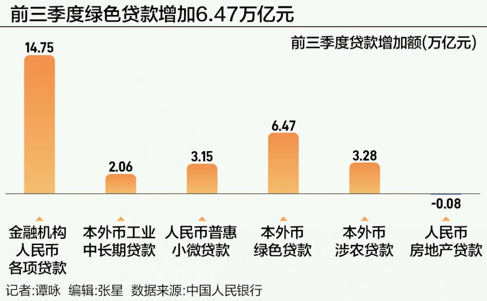 据中国人民银行统计,2025年三季度末,金融机构人民币各项贷款余额270.39万亿元,同比增长6.6%,前三季度人民币贷款增加14.75万亿元。其中,绿色贷款余额43.51万亿元,比年初增长17.5%,前三季度增加6.47万亿元。