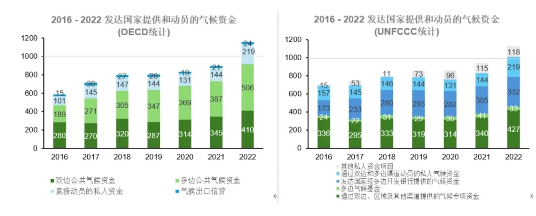 中央财经大学绿色金融国际研究院相关研究表明,自《哥本哈根协议》中“1000亿美元目标”提出以来,发达国家对其气候资金承诺兑现效果持续不佳,发达与发展中国家群体间对资金的“量”和“质”始终存在分歧。发达国家完成其承诺“量”的历史记录较差。经合组织(OECD)统计数据显示,2016–2022年7年间,发达国家动员资金总额5793亿美元,年均仅为827亿美元,联合国统计的同期总额与年均数据也仅为6044亿和863亿美元。同时,上述两统计口径均显示发达国家年均动员气候资金直到2022年才达到其承诺额,分别为1159亿和1129亿美元。因此,发达国家在完成气候资金承诺的总量和时效上均存在较大问题。