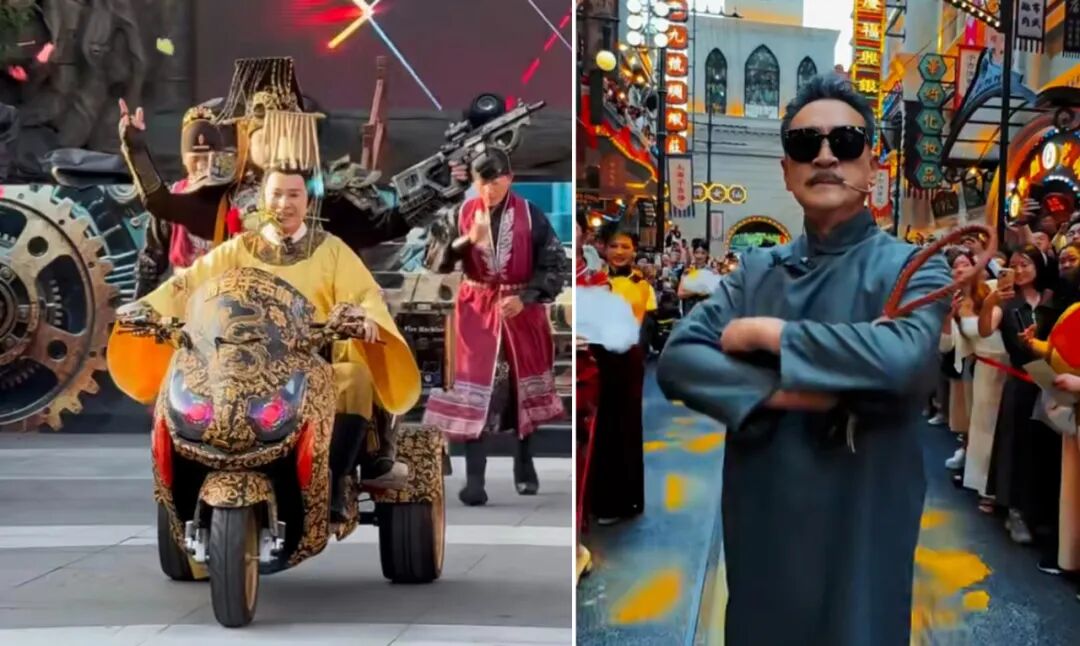还有70岁的“黑豹子”,老戏骨寇振海穿着《情深深雨蒙蒙》里的长袍马褂,在景区内重现当年“陆振华”的雄风。挥着鞭子讲着大家熟悉的台词,再来点反差感十足的“俏皮”表演,足以让在场见证的游客激动不已,拿起手机疯狂拍照录视频。