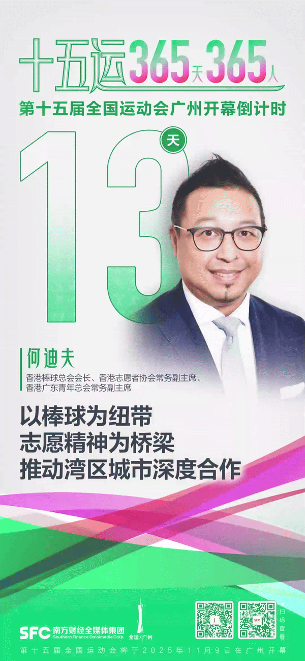 第十五届全国运动会是粤港澳三地首次联合承办的大型体育赛事。身兼香港棒球总会会长、香港志愿者协会常务副主席及香港广东青年总会常务副主席的何迪夫,以实际行动推动湾区城市体育协作与青年融合,为十五运会注入协同动能与青年活力。