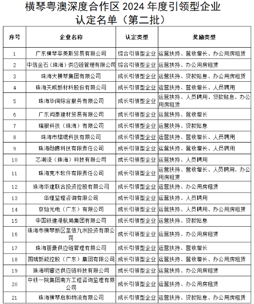 近日,横琴粤澳深度合作区2024年度引领型企业(第二批)认定名单公布。其中,共有2家企业被认定为2024年度综合引领型企业;共有23家企业被认定为2024年度成长引领型企业。