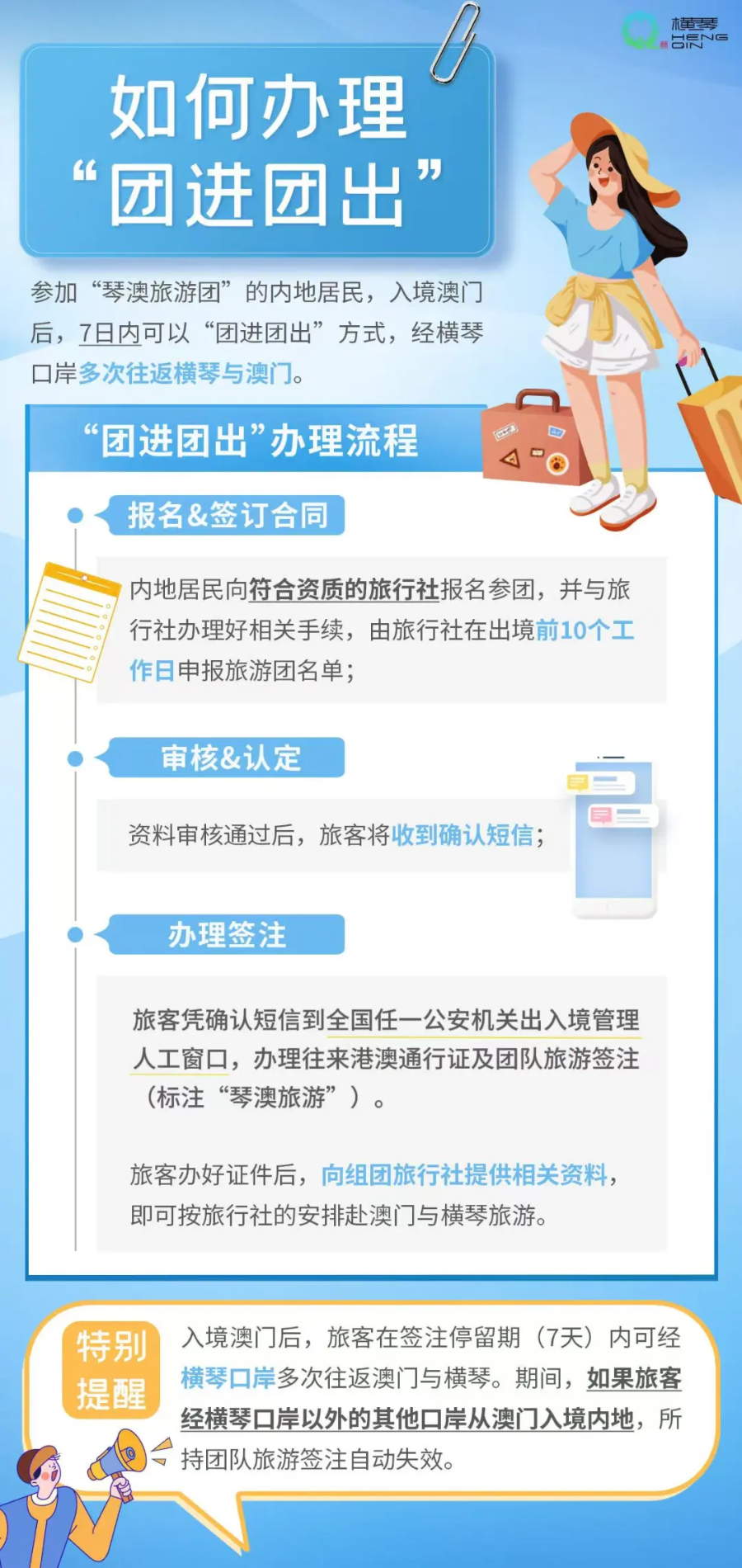 琴澳旅游团首次出境前往澳门特别行政区(简称:澳门特区)可从全国开放口岸出境,入境澳门特区后,7日内可经横琴口岸多次往返澳门特区和横琴粤澳深度合作区。期间旅游团旅客只能通过横琴口岸出入境。经横琴口岸以外的其他口岸从澳门特区入境内地的,其所持琴澳旅游专用往来澳门团队旅游签注即自动失效。