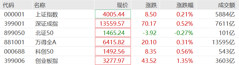 截至午盘,沪指涨0.21%,报4005.44点,深成指涨0.52%,创业板指拉升涨1.35%。全场超3000股上涨,半日成交量1.36万亿。