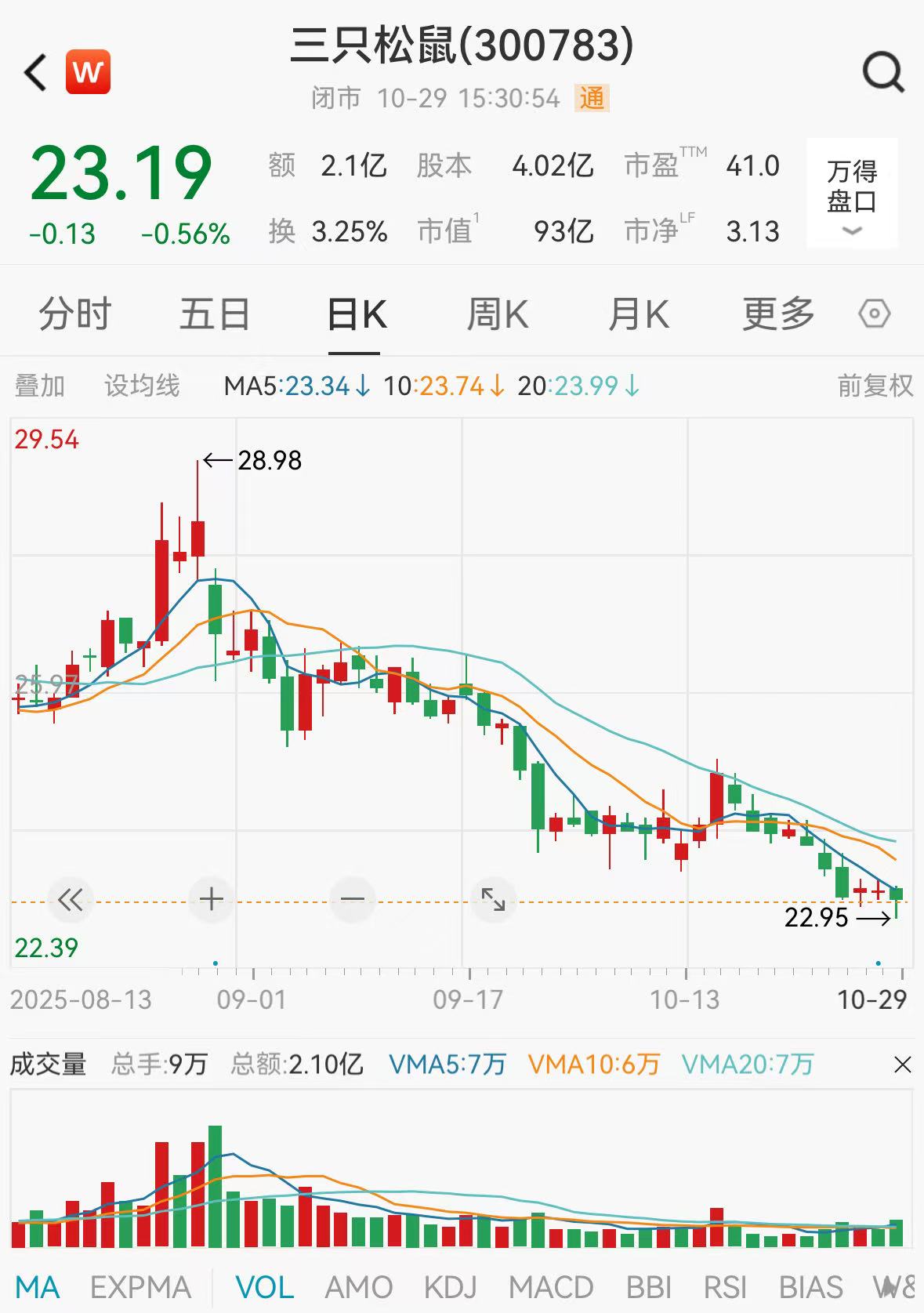截至收盘,三只松鼠报收23.19元/股,跌0.56%,总市值为93亿元,股价年内跌超36%。