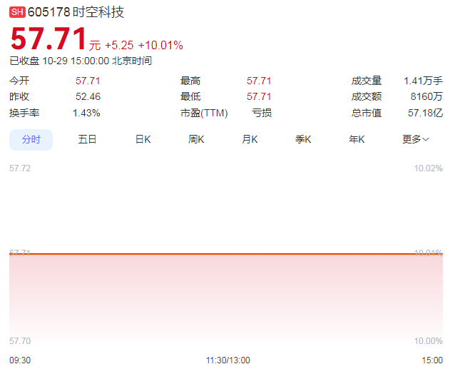 10月29日,时空科技再度涨停,至此已连续6个交易日涨停。当日收盘,该股报57.71元/股,成交额为8160万元,总市值为57.18亿元,流通市值同样为57.18亿元。此外,涨停板上封单超过6万手。