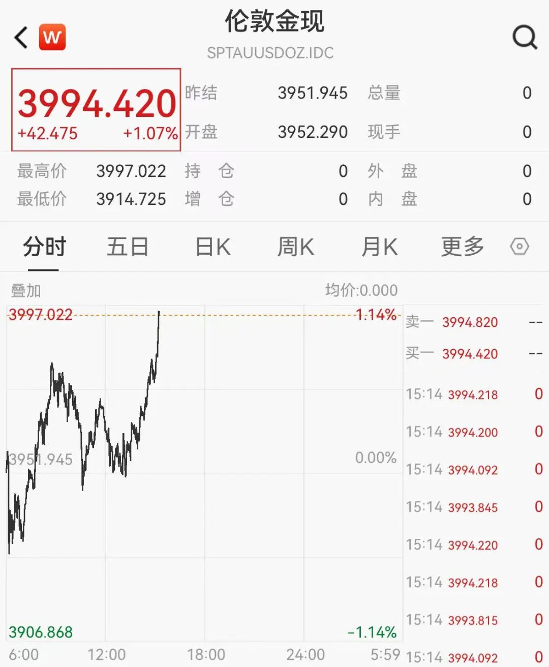10月29日下午,近日持续跌势的现货黄金出现短线拉升,截至15:15,涨1.07%,报3994.42美元/盎司。