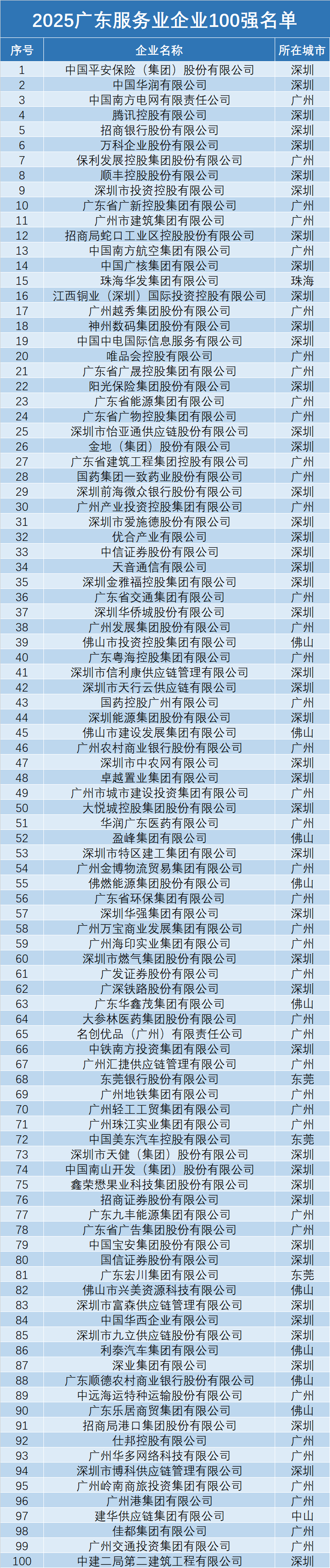 广东500强企业正加速向创新驱动与价值创造跃迁,成为新质生产力发展的关键载体。10月29日,广东省企业联合会、广东省企业家协会发布《2025广东500强企业发展报告》。其中,2025广东服务业企业100强详细名单如下。