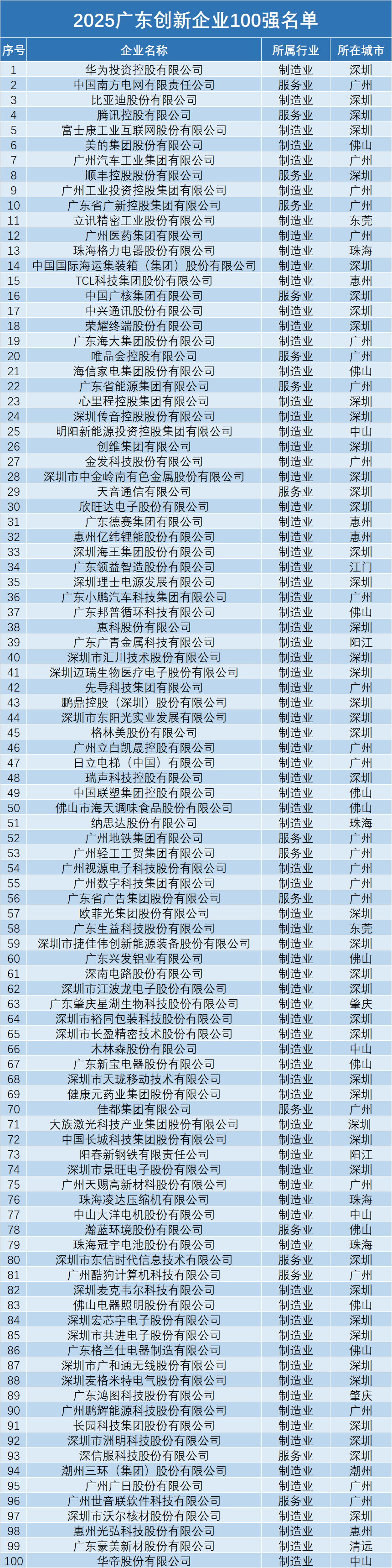 广东500强企业正加速向创新驱动与价值创造跃迁,成为新质生产力发展的关键载体。10月29日,广东省企业联合会、广东省企业家协会发布《2025广东500强企业发展报告》。其中,2025广东创新企业100强详细名单如下。