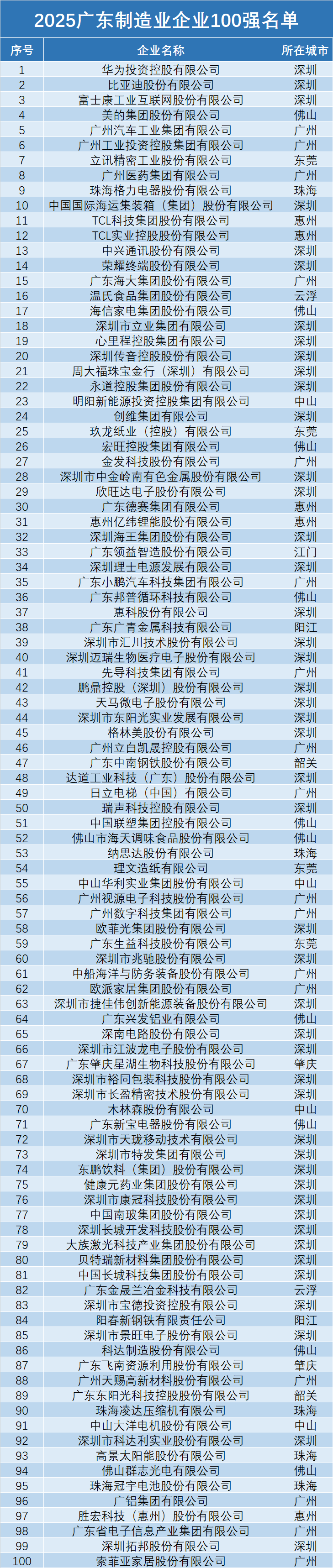 广东500强企业正加速向创新驱动与价值创造跃迁,成为新质生产力发展的关键载体。10月29日,广东省企业联合会、广东省企业家协会发布《2025广东500强企业发展报告》。其中,2025广东制造业企业100强详细名单如下。