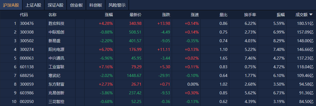 个股方面,胜宏科技成交额超180亿元居首,中际旭创、新易盛、阳光电源成交额靠前。