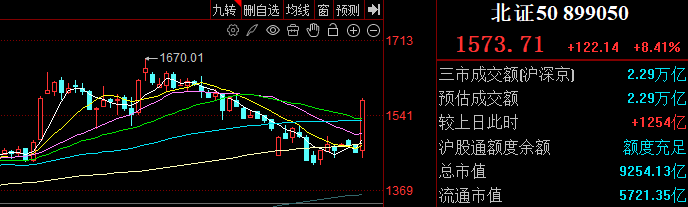北证50指数尾盘大涨8%,成份股全部上涨。数字人、锦华新材、三祥科技涨停,利通科技、华信永道等涨超20%。