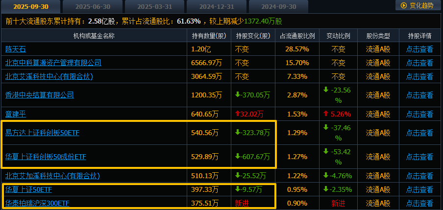 比如寒武纪,前十大流通股东当中,有4个是ETF。