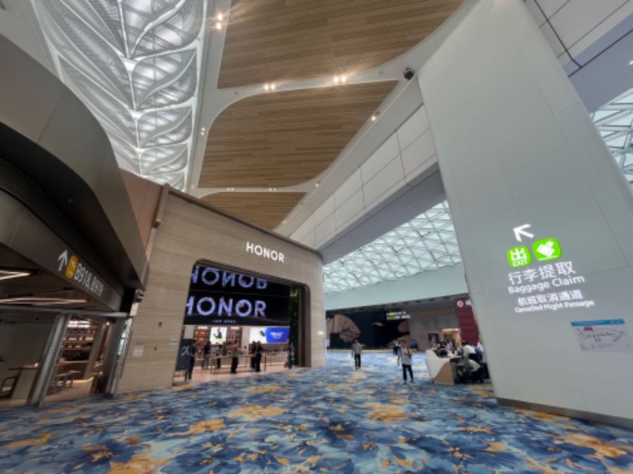 安检效率再提升,设有国内安检通道31条、国际安检通道9条(不含远期规划8条),创新采用“集中安检验证+RFID智能回筐”模式,21台双门自助核验设备每6秒即可完成1次身份核验,误识率低于0.1%,“人-筐-包”精准绑定让安检更有序。