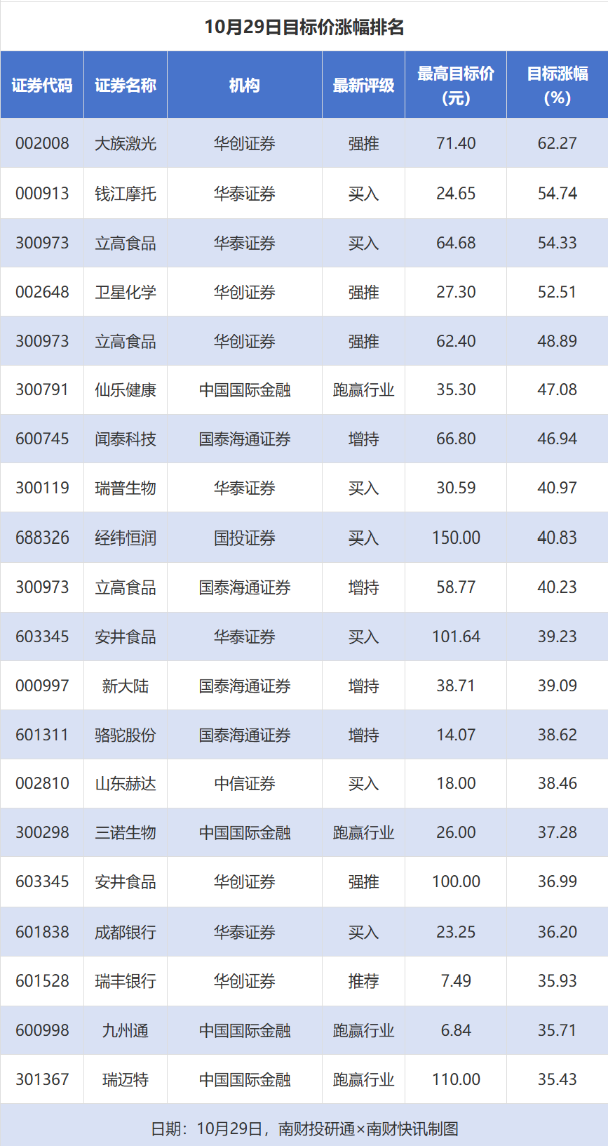 南财投研通数据显示,10月29日,券商给予上市公司目标价共193次,按最新收盘价计算,目标价涨幅排名居前的公司有大族激光、钱江摩托、立高食品,目标价涨幅分别为62.27%、54.74%、54.33%,分别属于自动化设备、摩托车及其他、休闲食品行业。