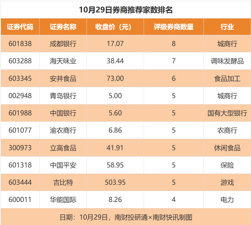 从券商推荐家数来看,10月29日有300家上市公司得到券商推荐,其中成都银行获得8家推荐,海天味业获得7家推荐,安井食品获得6家推荐。