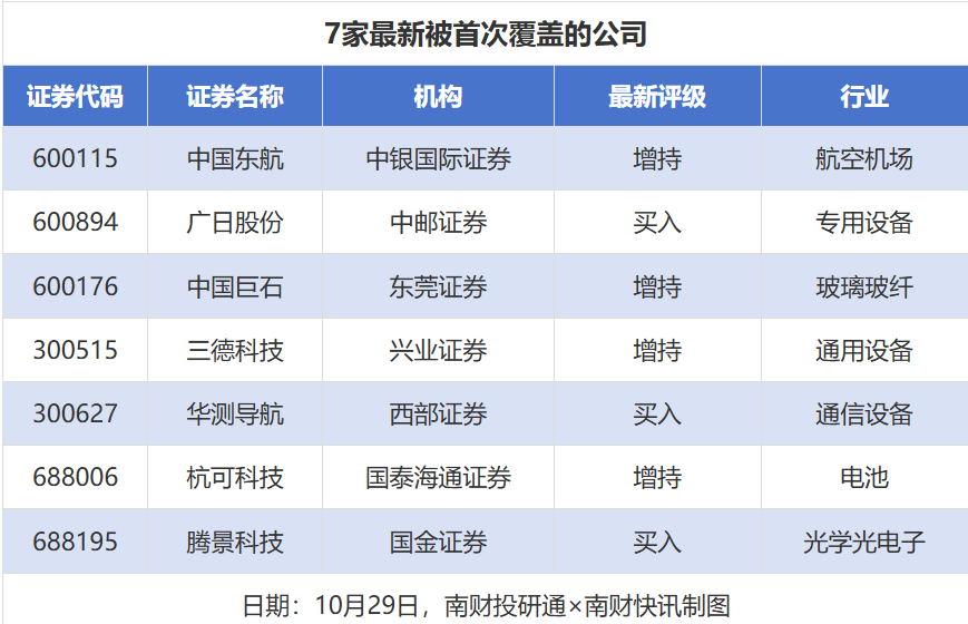 首次覆盖方面,10月29日券商共给出了7次首次覆盖,其中中国东航获得中银国际证券给予“增持”评级,广日股份获得中邮证券给予“买入”评级,中国巨石获得东莞证券给予“增持”评级,三德科技获得兴业证券给予“增持”评级,华测导航获得西部证券给予“买入”评级。