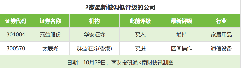 评级调低方面,10月29日,券商调低上市公司评级达到2家次,最新数据包括了华安证券对嘉益股份的评级从“买入”调低至“增持”,群益证券(香港)对太辰光的评级从“买进”调低至“区间操作”。