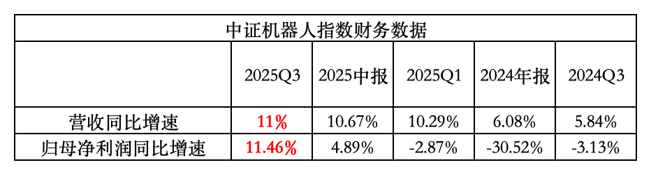 随着三季报的陆续披露,中证机器人指数成份股的营收、净利润同比增速均录得上行。据Wind,2025年Q3营收同比增速为11%,归母净利润的同比增速为11.46%,扭转了此前增幅为负的态势,业绩上行趋势或得到进一步确认。