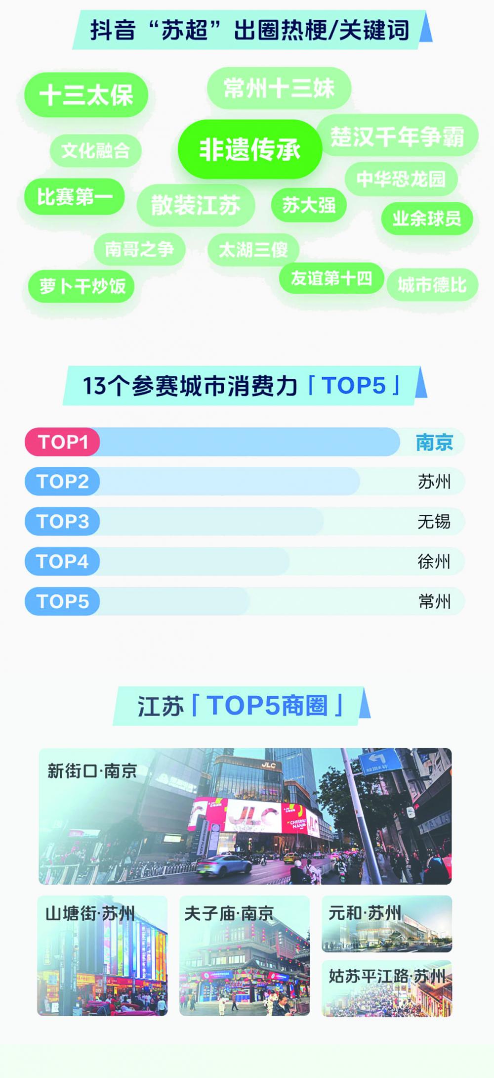抖音生活服务相关负责人介绍,赛事期间,平台发起“跟着苏超游江苏”活动,联合各地官方、商家、明星达人打造多城看球打卡吃喝玩乐新体验,激发线下生意,丰富用户观赛生活。7月16日至9月14日,活动带动江苏消费超135亿元,同比增长49%。活动打造徐州、淮安、泰州、盐城、南通、南京等多个“苏超”第二观赛现场,线上线下全面激发赛事经济。