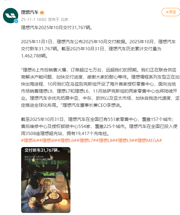 据理想汽车官方微博,2025年10月,理想汽车交付新车31767辆。截至2025年10月31日,理想汽车历史累计交付量为1462788辆。
