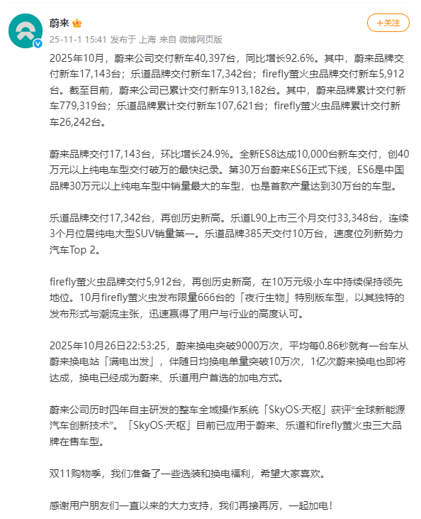 据蔚来汽车官方微博,10月蔚来交付新车40397台,同比增长92.6%,首次超过4万台。