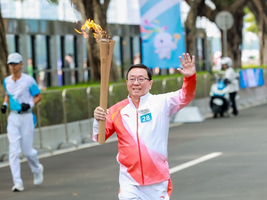 11月2日上午,第十五届全国运动会火炬传递在广州、深圳、香港、澳门四地同步开跑。广州首批“城市推广大使”、香港科技大学(广州)校长倪明选作为科技工作者代表,担任广州站第28棒火炬手,在晴波路完成火炬传递。