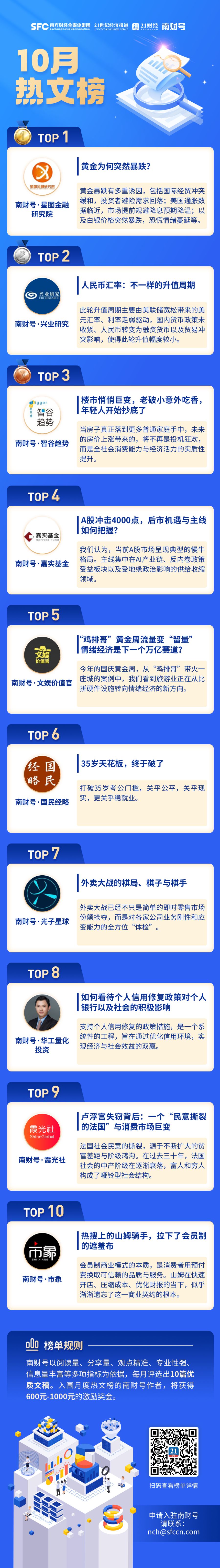 南财号以阅读量、分享量、观点精准、专业性强、信息量丰富等指标为依据,每月评选出10篇优质文稿。入选月度热文榜的南财号作者,将获得600元—1000元的激励奖金。