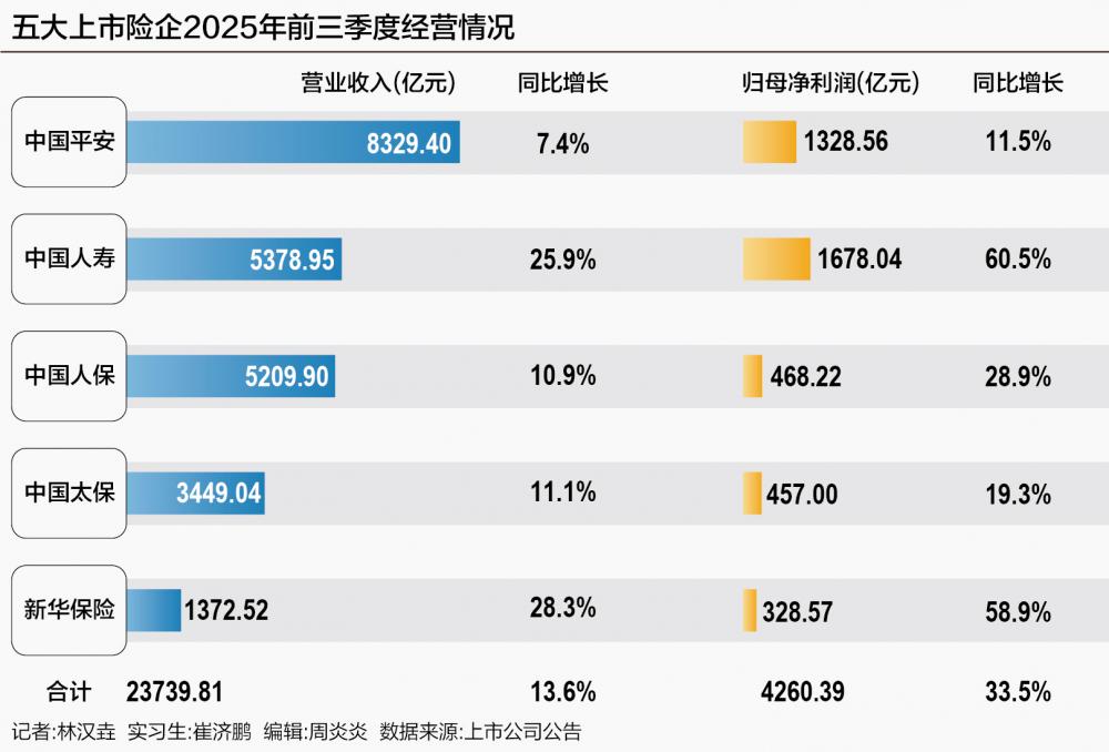 近期,中国平安、中国人寿、中国人保、中国太保和新华保险五大A股上市险企相继披露2025年前三季度业绩报告。