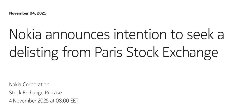 诺基亚表示,公司董事会已决定提交申请,将其股票(ISIN:FI0009000681)从巴黎泛欧证券交易所(Euronext Paris)摘牌。