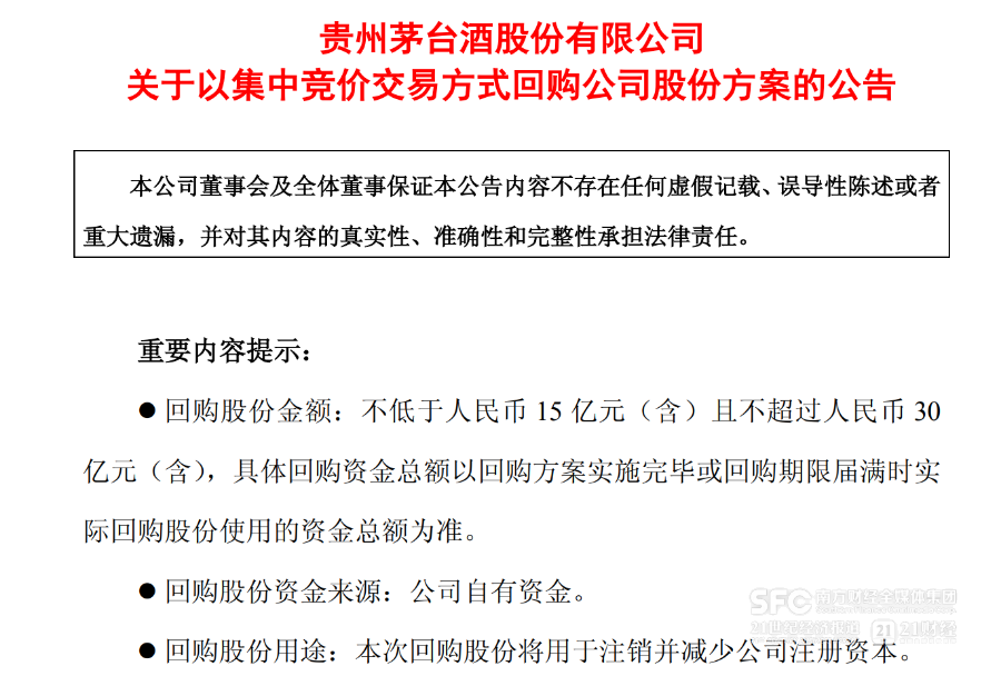 11月5日晚间,贵州茅台披露,在股东大会通过后6个月内,公司将用自有资金回购公司股份后注销,回购金额不低于人民币15亿元(含)且不超过人民币30亿元(含),回购价格不超过1887.63元/股。