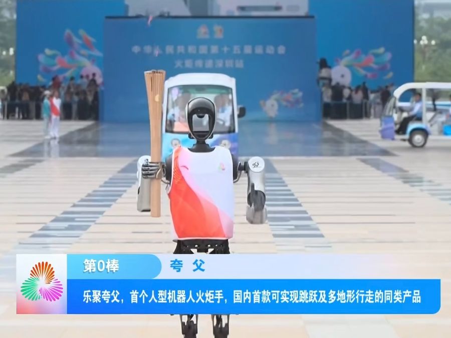 十五运会火炬传递深圳站现场,全球首个5G-A人形机器人“夸父”手持1.6KG的火炬,以高度拟人的奔跑姿态,完成百米传递任务。