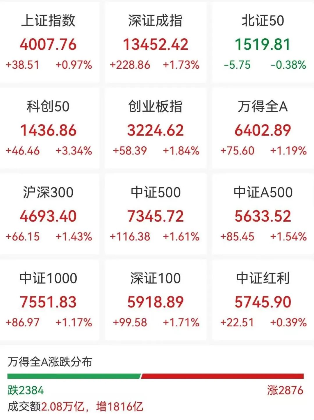 11月6日,A股市场全天震荡走强,沪指放量涨近1%重回4000点。截至收盘,沪指涨0.97%,深成指涨1.73%,创业板指涨1.84%。市场成交额2.08万亿,全市场近2900只个股上涨。