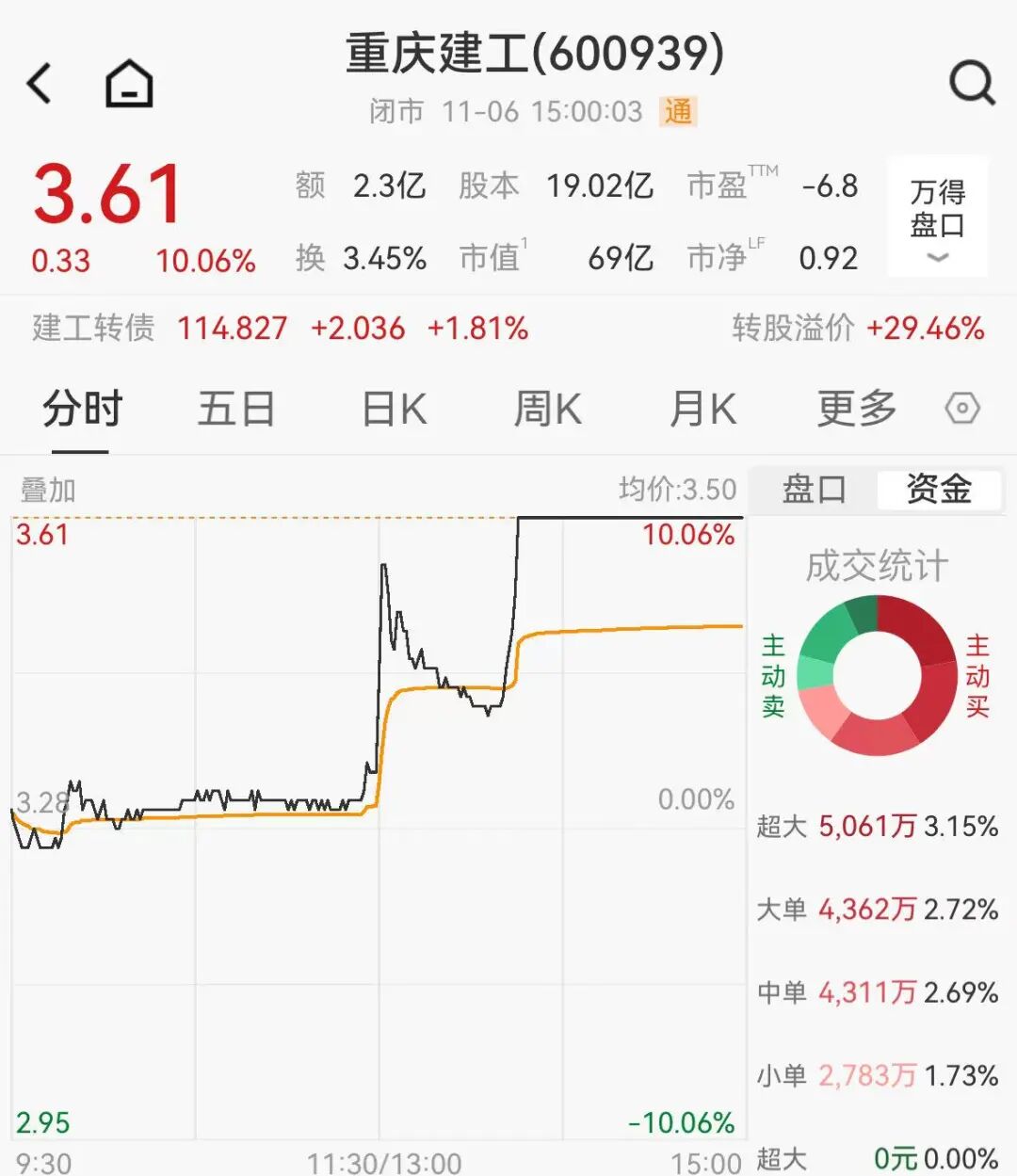 11月6日午后,重庆本地股突然大幅拉升。其中,重庆建工直线拉升涨停板。渝开发尾盘涨停、重庆路桥、重庆港、渝三峡A等跟涨。
