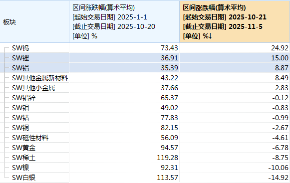 根据Wind统计,10月21日至11月5日,申万有色金属板块集体调整,仅有少数板块取得正收益,其中钨、铝、锂则成为行业内部的领涨品种。