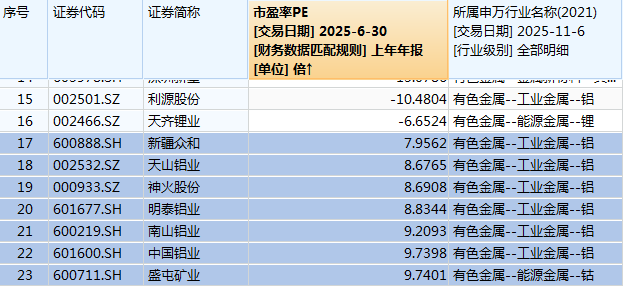 以今年6月末的节点数据为例,根据收盘价与2024年每股收益计算的市盈率,申万有色金属板块中估值最低的个股清一色是铝业公司(剔除负值),比如市盈率8倍以下的新疆众合,市盈率8倍至9倍的天山铝业、神火股份、明泰铝业。