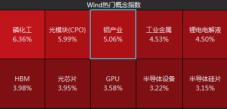 这不是个股异动,而是铝板块的系统性上涨,当天闽发铝业、常铝股份等多只铝业个股出现涨停,铝产业指数5.06%的涨幅亦位居各大概念板块第二位。