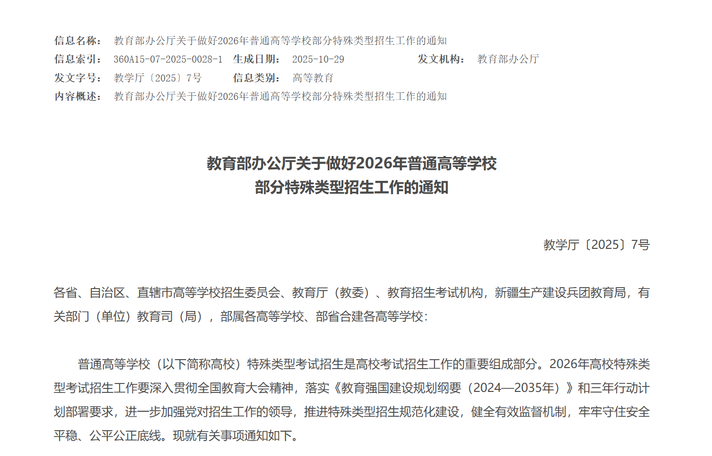 教育部近日印发《关于做好2026年普通高等学校部分特殊类型招生工作的通知》(下称《通知》),首次对综合评价招生工作进行系统性规范。