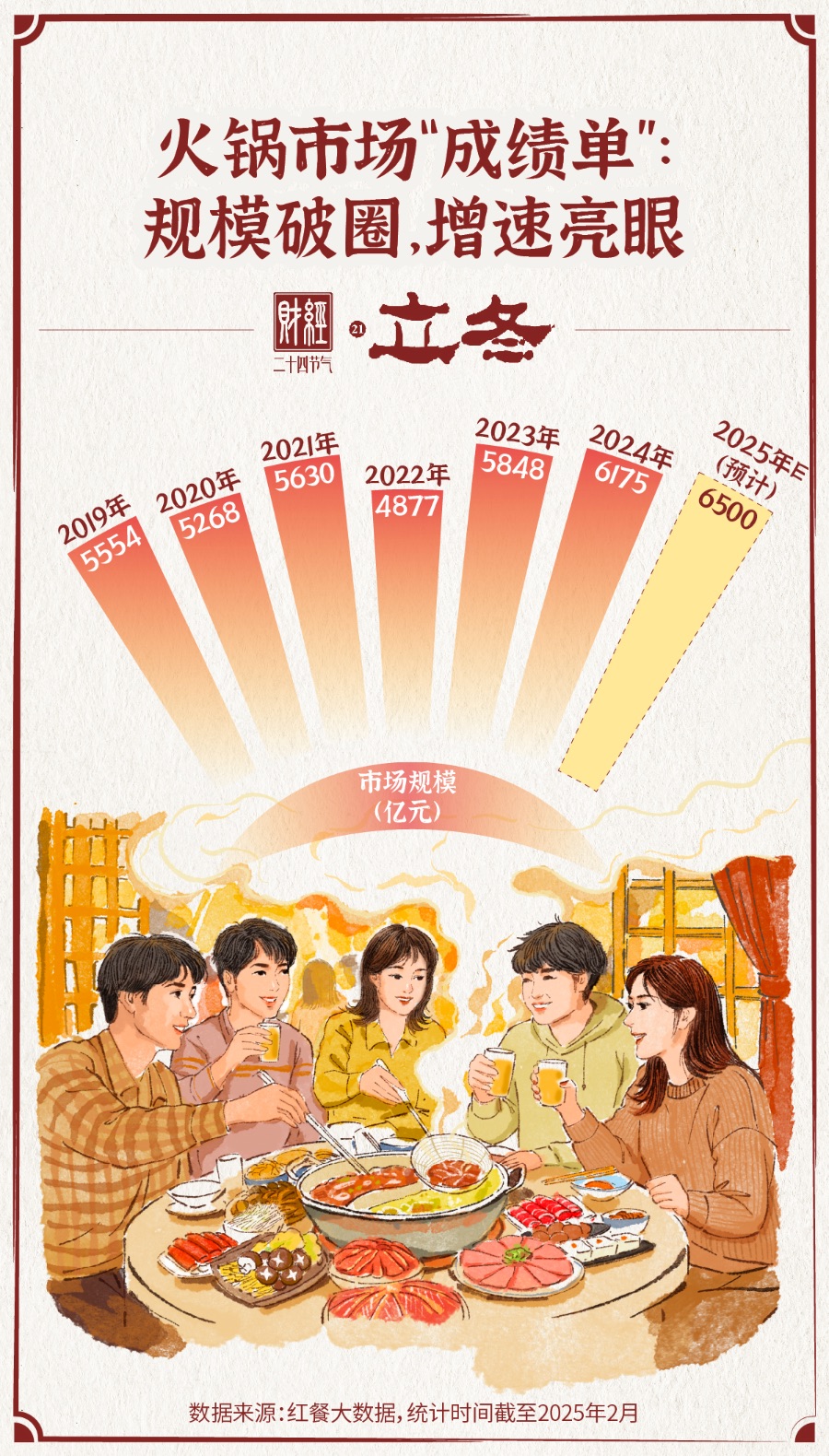 立冬已至,寒意渐浓,最能抚慰味蕾与心绪的,莫过于一顿热气腾腾的火锅。近年来火锅行业整体规模持续扩大,据红餐产业研究院与聚慧餐调联合发布的《火锅产业发展报告2025》,2024年全国火锅市场规模达到6175亿元,同比增长5.6%,增速高于整体餐饮大盘,预计2025年全国火锅市场规模将达6500亿元。