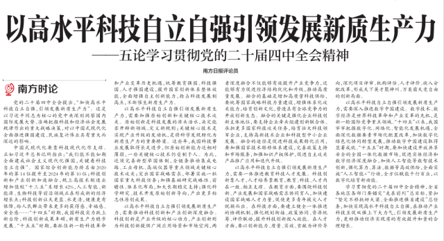 党的二十届四中全会提出“加快高水平科技自立自强,引领发展新质生产力”。这是以习近平同志为核心的党中央深刻洞察国内国际发展大势、准确把握科技和经济社会发展规律作出的重大战略决策,对以中国式现代化全面推进强国建设、民族复兴伟业具有重大而深远的影响。