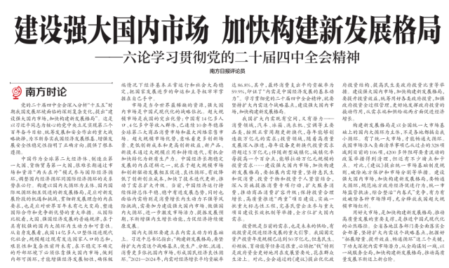 党的二十届四中全会提出“建设强大国内市场,加快构建新发展格局”。这是以习近平同志为核心的党中央立足实现第二个百年奋斗目标、统筹发展和安全作出的重大战略抉择,为不断夯实我国经济发展根基、增强发展安全性稳定性指明了正确方向、提供了根本遵循。