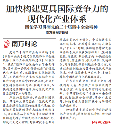 “十五五”规划建议第一条战略任务就是“建设现代化产业体系,巩固壮大实体经济根基”,足见现代化产业体系在社会主义现代化建设全局中的重要地位,也为广东坚持实体经济为本、制造业当家,加快构建更具国际竞争力的现代化产业体系指明了方向路径。