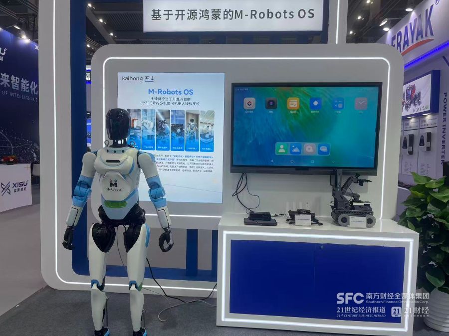 当前,开源鸿蒙生态正逐步落地,推动智能操作系统迈入新阶段。深圳开鸿数字产业发展有限公司在现场展示了基于“M-Robots OS”的多形态机器人协同作业能力,包括开鸿“驭”系列四足机器狗、开鸿“驭”系列移动机器人,以及数字华夏的“夏起”机器人,可以与平板、大屏等终端快速组成超级终端。