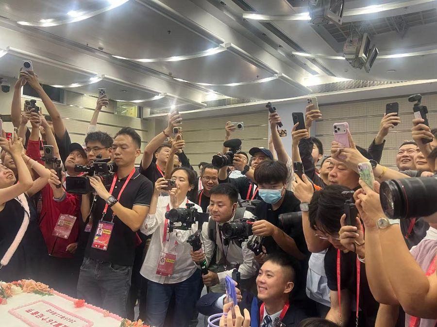 岭南集团旗下岭南餐饮策划工作室文化总监朱嘉明借蛋糕装饰向与会记者表达祝福:“希望大家每一次出发都能拍下精彩瞬间、爆出绝妙金句、写下生动文章,讲好广东故事。同时,也祝愿大家每天拥有喜洋洋的心态、乐融融的活力。”