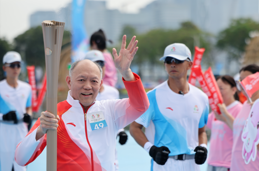 图为香港霍英东集团行政总裁、全国人大代表、亚洲武术联合会副主席霍震寰担任十五运火炬手